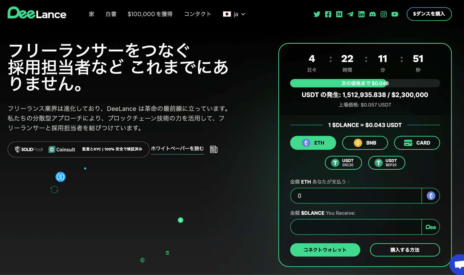 $DLANCE(イーサリアムブロックチェーン)はDeeLanceエコシステムで使用されるネイティブトークンです。$DLANCEトークンの総供給量は10億(1,000,000,000)でトークン購入方法について、公式サイトに詳細があります。現時点、ネイティブトークンである$DLANCEは、1 $DLANCE = $0.043 USDT相当金額にしていあす。$DLANCEトークンはエコシステム内でNFTの購入やメタバース内の土地やオフィスの取得に利用できます。このトークンはユーザーがトランザクションをスムーズに行えるよう設計され、全体の体験を向上させます。プレセール実施中