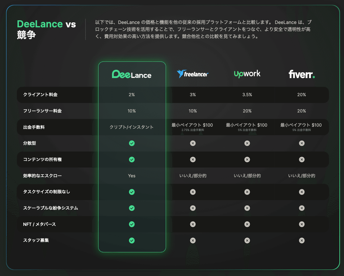 DeeLanceは、全く新しい形のコラボレーションを提供します。これは、世界中の最高の才能と雇用者をつなげる分散型の雇用プラットフォームで、ブロックチェーンの統合を通じて透明性とセキュリティを向上させ、コストを削減し、効率を高めることが可能です。DeeLanceのメタバースは、ブロックチェーンを活用したフリーランス採用に特化したデジタル空間で、既存の大手Web2.0フリーランスサイトよりも低料金で、フリーランサーとクライアントの双方に利益を提供する設計が施されています。