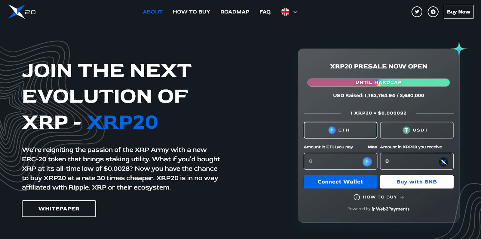 XRP20を購入するプロセスは、ETHまたはUSDTをウォレットに送金し、ウォレットをサイトに接続し、ETHまたはUSDTをXRP20に交換し、リスト化の日にトークンを請求するというものです。ローンチ後の計画には、XRP20に積極的に関与するコミュニティを育成し、トークンバーニングメカニズムを実装し、プリセールフェーズ中に広範なマーケティング戦略を展開することが含まれています。XRP20は、XRPのような成功したレガシートークンを逃した人々に新たな機会を提供するものとして提示されています。