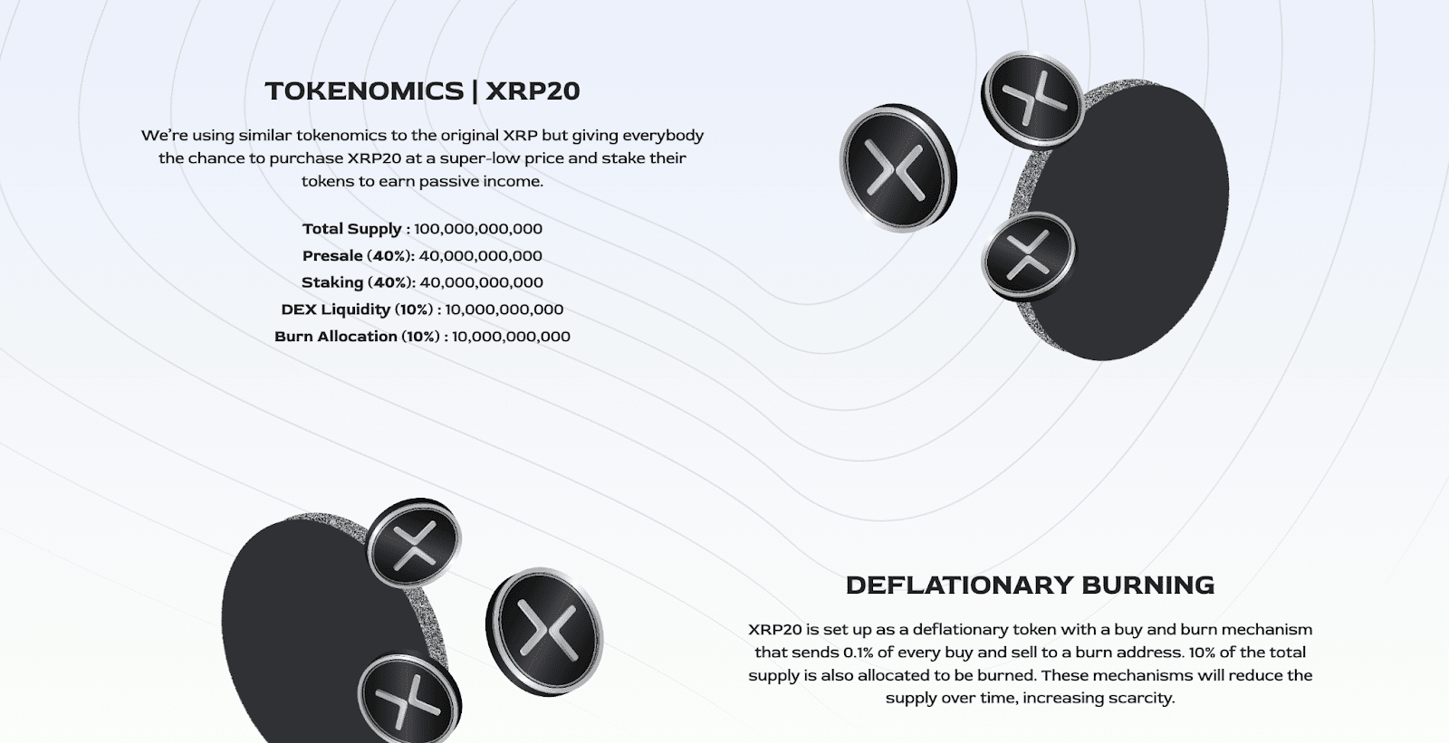 XRP20は、XRP Ledger上に構築された暗号通貨トークンです。支払い処理、送金、その他の金融取引など、さまざまな目的のために設計されています。XRP20は、バイアンドバーン機能を備えたデフレーショナリーなメカニズムを採用しています。各取引によって0.1%がバーンされ、総供給量の20%も時間をかけてバーンされることが計画されており、これによりトークンの希少性が高まります。XRP20購入