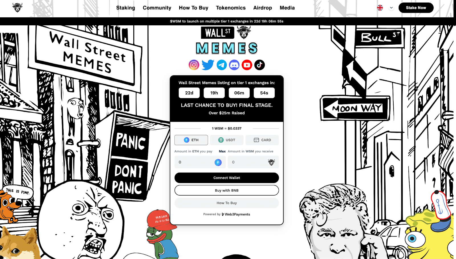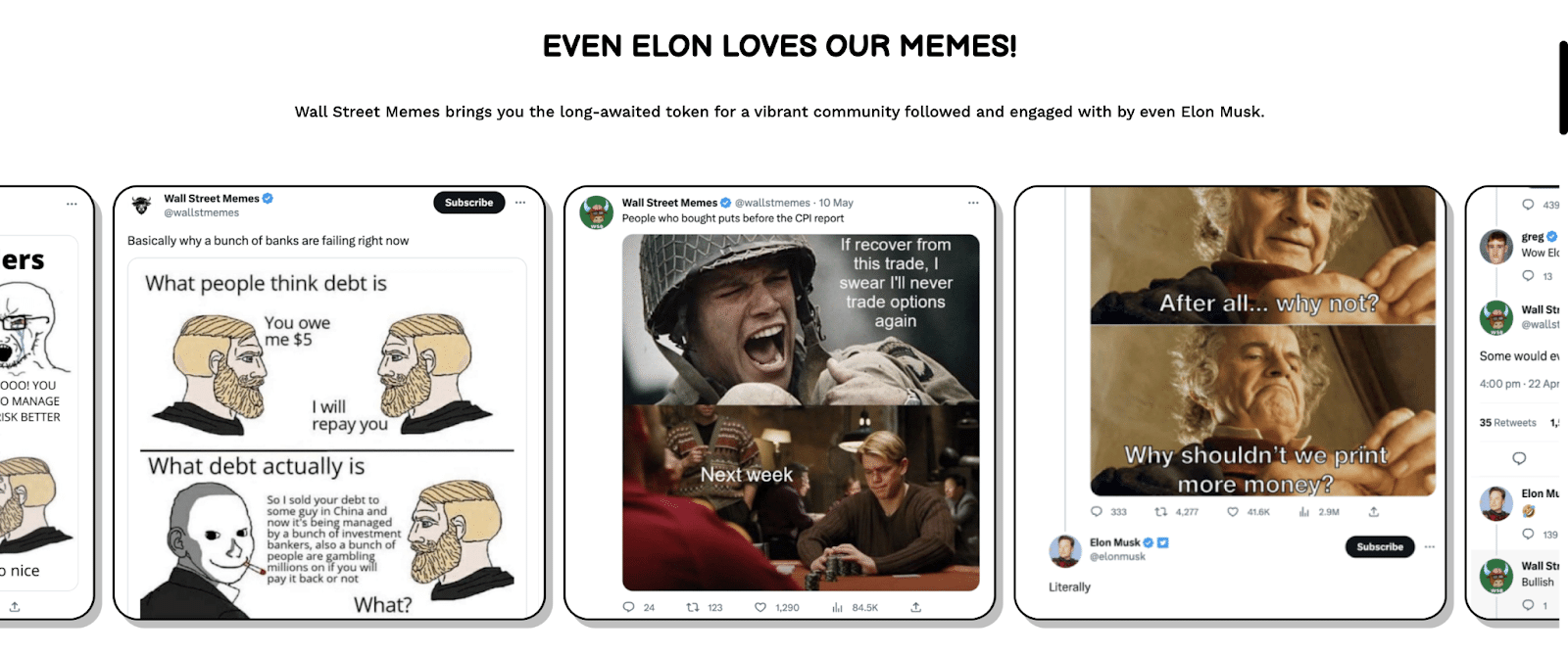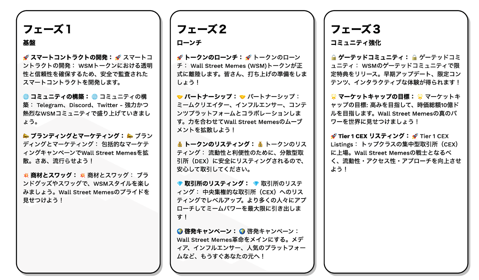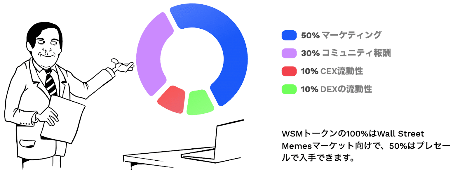 Wall Street Memesのストーリ:「2021年の悪名高いGameStopの騒動で、小さな投資家たちがウォール街に挑戦し、その勇敢なWall Street Betsの英雄たちの遺産は今日まで生き続けています。Wall Street Memes(ウォール街ミーム)はその運動から生まれました—インターネットが暴走する資本主義に打ち勝った究極の表現です。80年代にGordon Gekko(ゴードン・ゲッコー)が「貪欲こそがよい」と言って無意味な株で富を築いたように、約30年後、数百ものおそらくさらに無意味なメームコインが一般の人々に同じことを可能にしています。」Wall Street Memesはこの運動をトークン化しています。今日$WSM軍に参加して、貪欲が非常によいことであると証明しましょう。