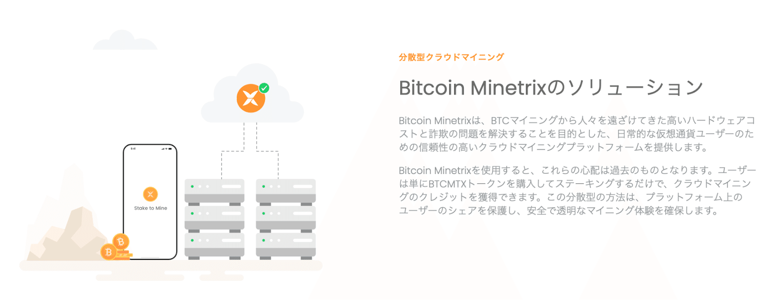 ビットコインのマイニングはコストが高く、多くの人々にはアクセスが難しいものとなっています。しかし、Bitcoin Minetrixのクラウドマイニングプラットフォームを利用すれば、BTCMTXトークンを購入してステーキングすることで、マイニングへの参加が可能になります。過去には、クラウドマイニングサービスの中に詐欺的なものも存在し、その評判を悪化させる原因となりました。しかし、Bitcoin Minetrixは分散化されたアプローチを採用することで、このようなリスクを軽減してクラウドマイニングの信頼性を高めるソリューションを提供しています。