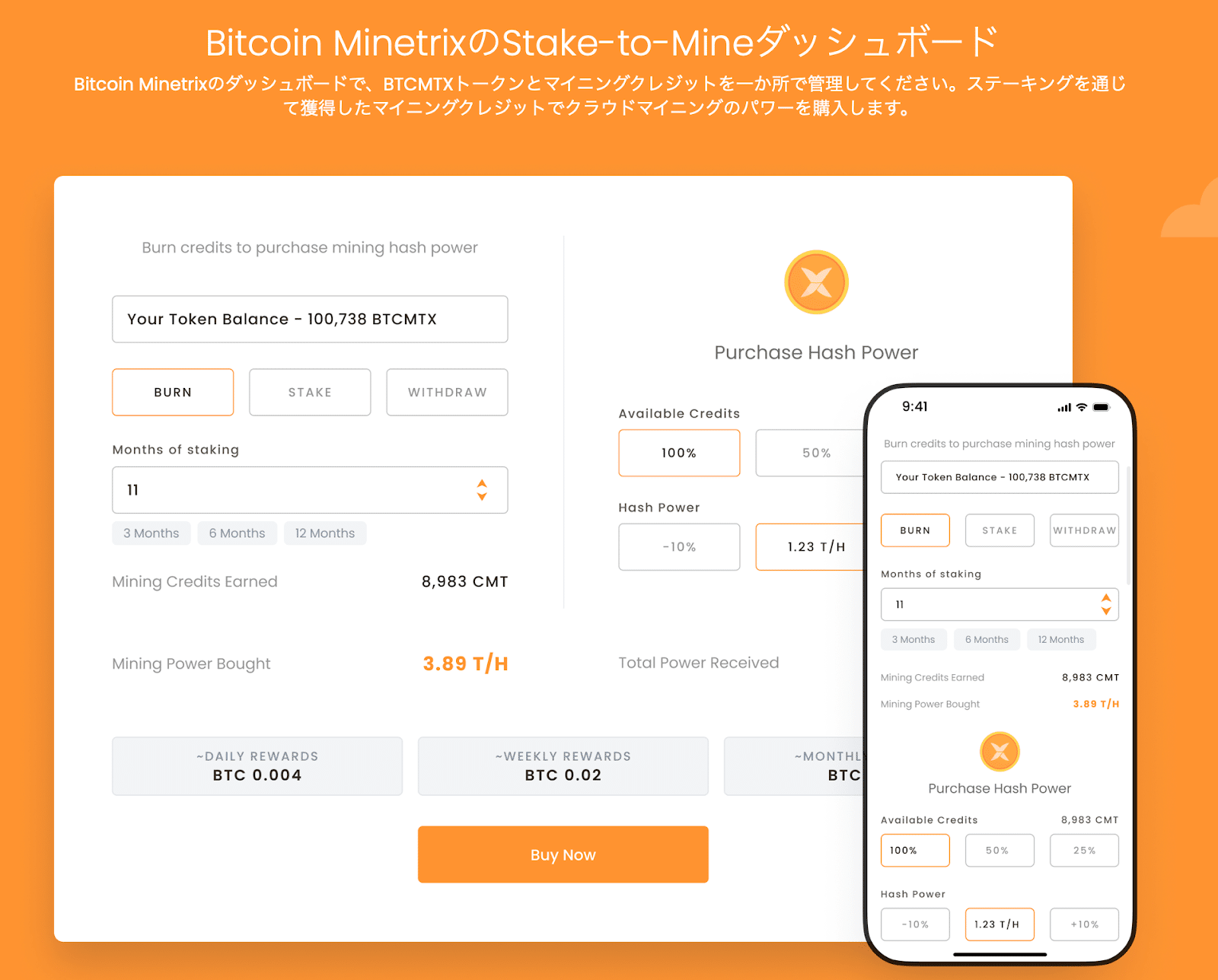 ステーキングされたBTCMTXからマイニングクレジットが生成されます。これらのクレジットを使用してビットコインのクラウドマイニングパワーを購入します。クレジットを多く使用することで、より多くのビットコインを手に入れることができます。