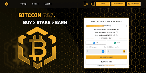 「BTCBSC」はBNBスマートチェーン上で生まれたビットコインの環境に優しいBEP-20バージョンです。このプロジェクトは、ビットコインの初期の2011年からの歴史をシミュレートしており、ビットコインが10分ごとに新しいBTCをリリースするのと同じ方法で、BTCBSCトークンがステーキングスマートコントラクトを通じてユーザーに支給されます。