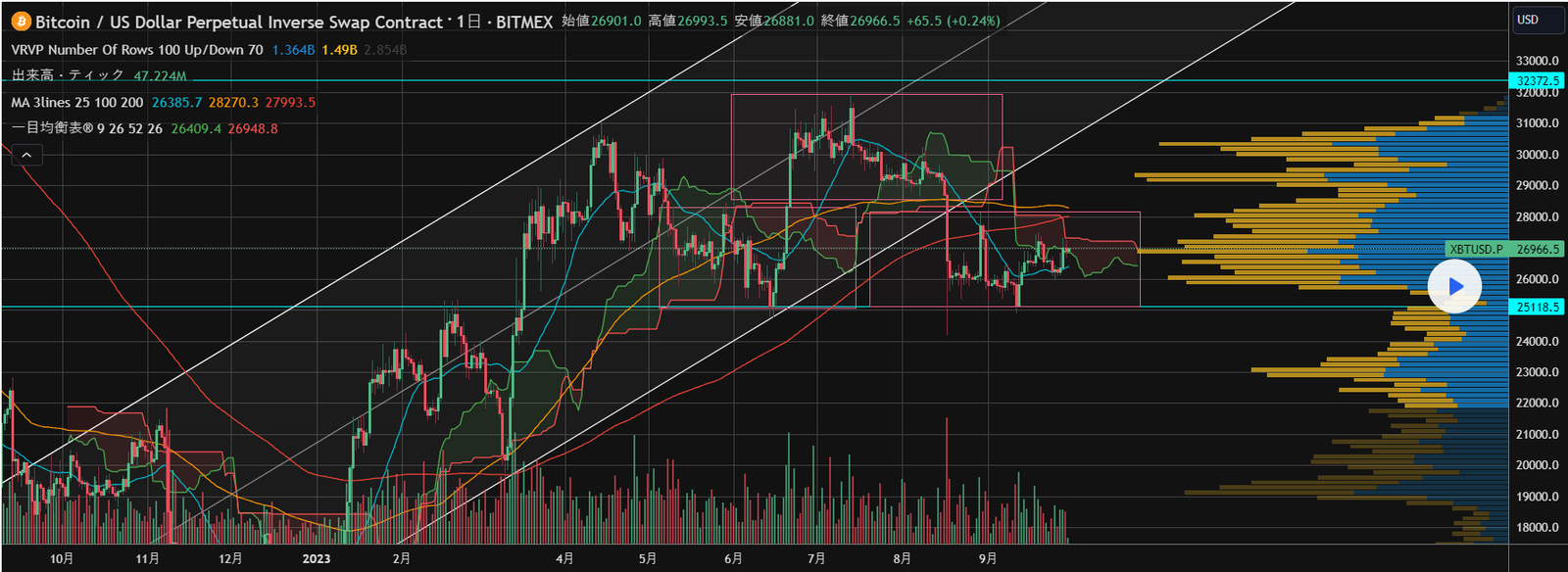 25000ドルを割って日足の実体をつけた場合はレンジが一段下に下がると見る