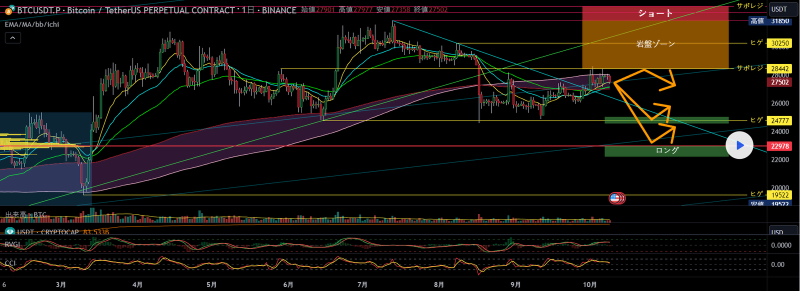 28442のライン付近まで上昇し、レンジ上限付近を推移中。28442のラインより上は岩盤ゾーンで一気に上抜けることは難しいと思われ、ここから下値を試すかレンジとなるか。
