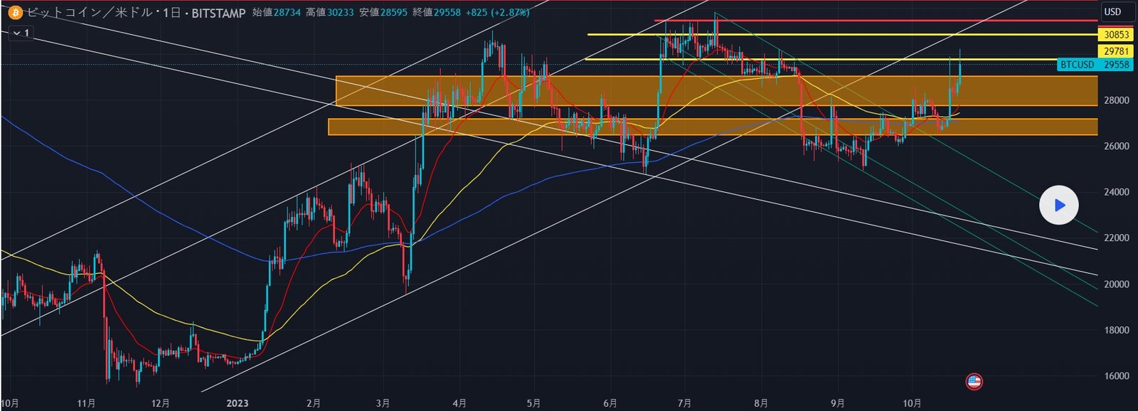 暗号通貨が戦争に使われていることに加えて、今回のフェイクニュースによって上昇したことでSECが以前から指摘している「市場操作」が簡単にできることが露わとなってしまったため、SECにBTCのETF承認を先送りする口実を与えてしまったことはETF承認に不利に働く可能性があるでしょう。また、ショートが焼かれてしまったことで、大きく上昇する燃料も切れてしまったようにも見えるため、やはり劇的な上昇にはつながりにくいように見えます。
