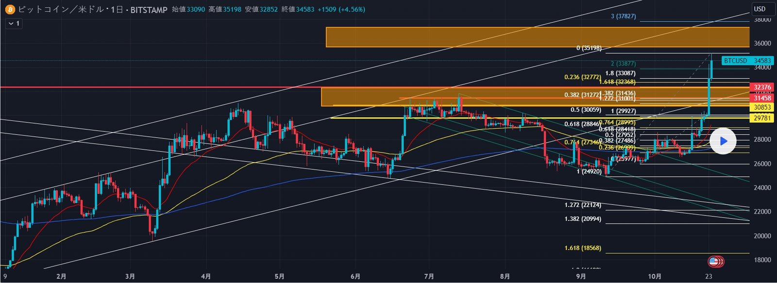ビットコインが急激な動きを見せ始めてますが、現状は米ドル流動性指標に対してはかなり上ザヤとなっておりチャネルライン上限でもある$35680~37310より上を追いかけていくのは危険だと思うので様子見ですね。