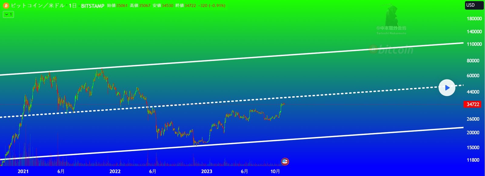 ビットコインの大規模な上昇チャネルは中間トラックを突破しようとしており、目標は上部トラックの上部白線に到達することです。