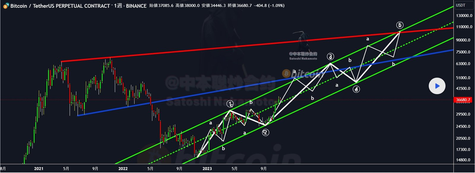ビットコインの100,000トレンドトレンドチャネル、主な目標は100,000米ドル以上に達することです、緑は上昇チャネル、青線は最初の目標価格、赤線は最終目標価格、白は市場トレンド、 1波、2波、3波に分かれる 4波または5波、1波が突破、3波が急上昇、5波がトップに到達 各波にはABCトレンドが含まれる 以上が10万ドルへの条件となります。強気相場が始まった。