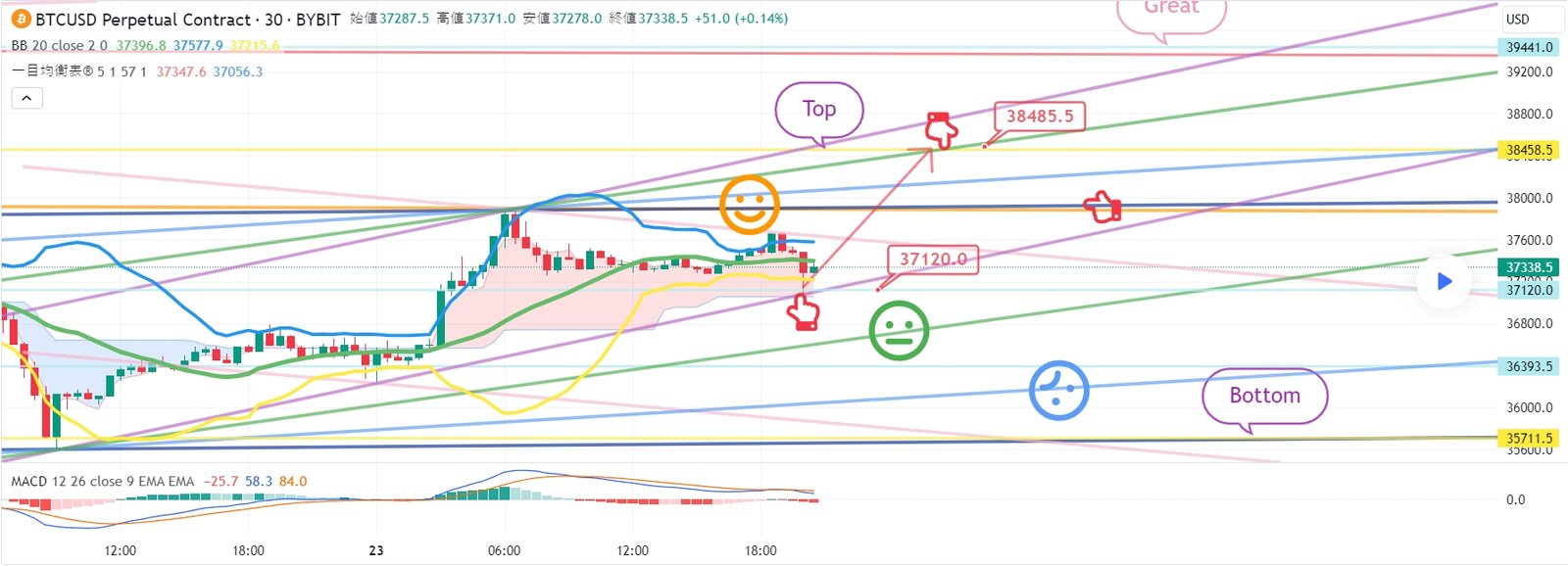 2. 38485.5ブルロングポジション1次ターゲット -> Great区間2次ターゲット