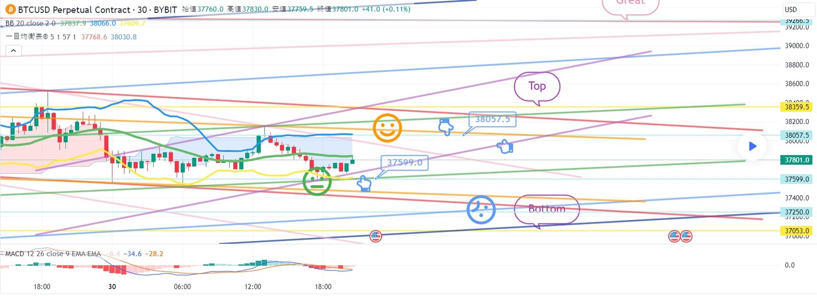 2. 38057.5ブルロングポジション1次ターゲット -> Top区間2次ターゲット