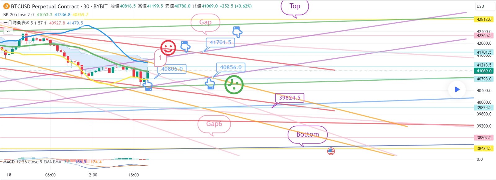 水色の支持線区間39824.5火またはBottomまで下落することがあります。