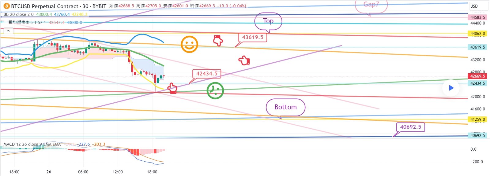 43619.5火曜日昨日の1次ターゲット、トップセクションの2次ターゲットです。