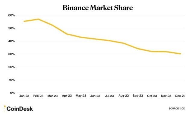 CCDataが提供したデータによると、バイナンスの12月現時点のシェアは30.1%、年初は55%だった。2023年1月から9月にかけて、同取引所の月間取引高は4740億ドルから1140億ドルへと70%以上減少。だがシェアは低下しているものの、9月以降、月間取引高は増加しているとCCDataは指摘している。