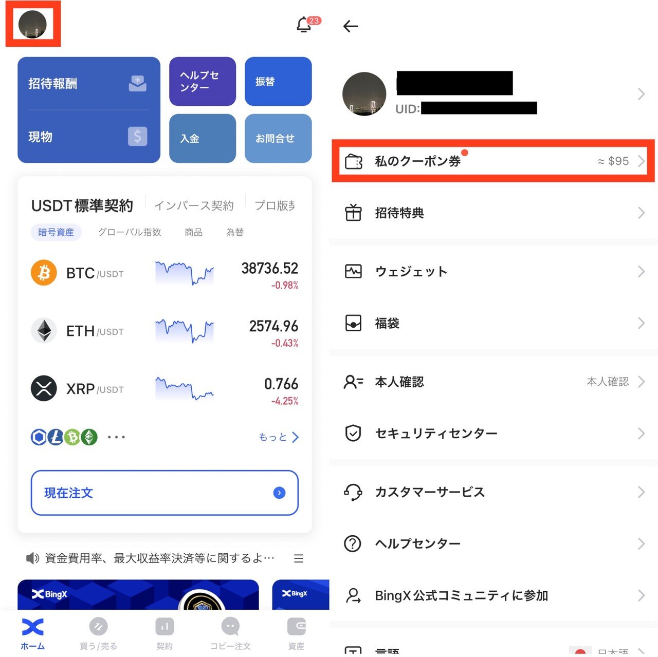 ボーナス確認方法:アプリで「ログイン」→「アカウント」→「私のクーポン券」