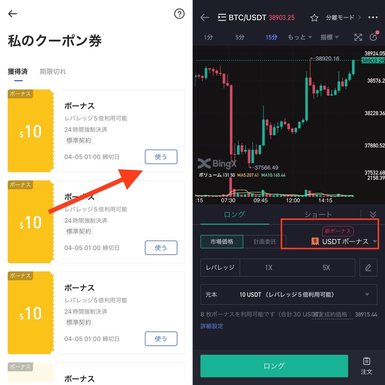 注意:利用条件の取引金額が、ボーナス付与してからカウントされて累計金額になります。また、10万取引量はレバレッジをかけた後の金額となります。例:500$USDTx20倍x10回の場合。ボーナス利用条件クリアの取引金額の計算がボーナス券の利用にはカウントできません。