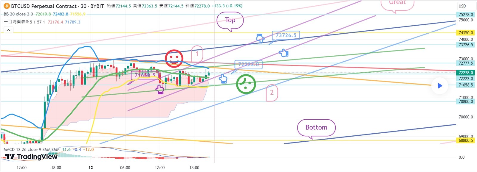 2. 73726.5ブルロングポジション1次ターゲット -> Top区間2次ターゲット-> Great 3次ターゲット