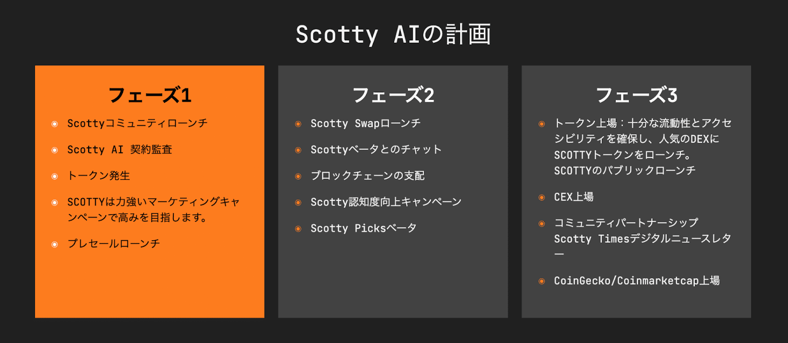 取引所でのリスティングとコミュニティとのパートナーシップを通じて、プロジェクトはその地位を確固たるものとしています。この段階は、Scotty the AIが市場内での新たな機会を創出するための重要なステップです。