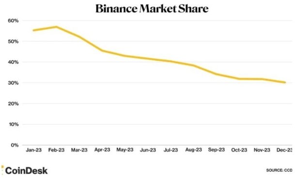 CCDataが提供したデータによると、バイナンスの12月現時点のシェアは30.1%、年初は55%だった。2023年1月から9月にかけて、同取引所の月間取引高は4740億ドルから1140億ドルへと70%以上減少。だがシェアは低下しているものの、9月以降、月間取引高は増加しているとCCDataは指摘している。