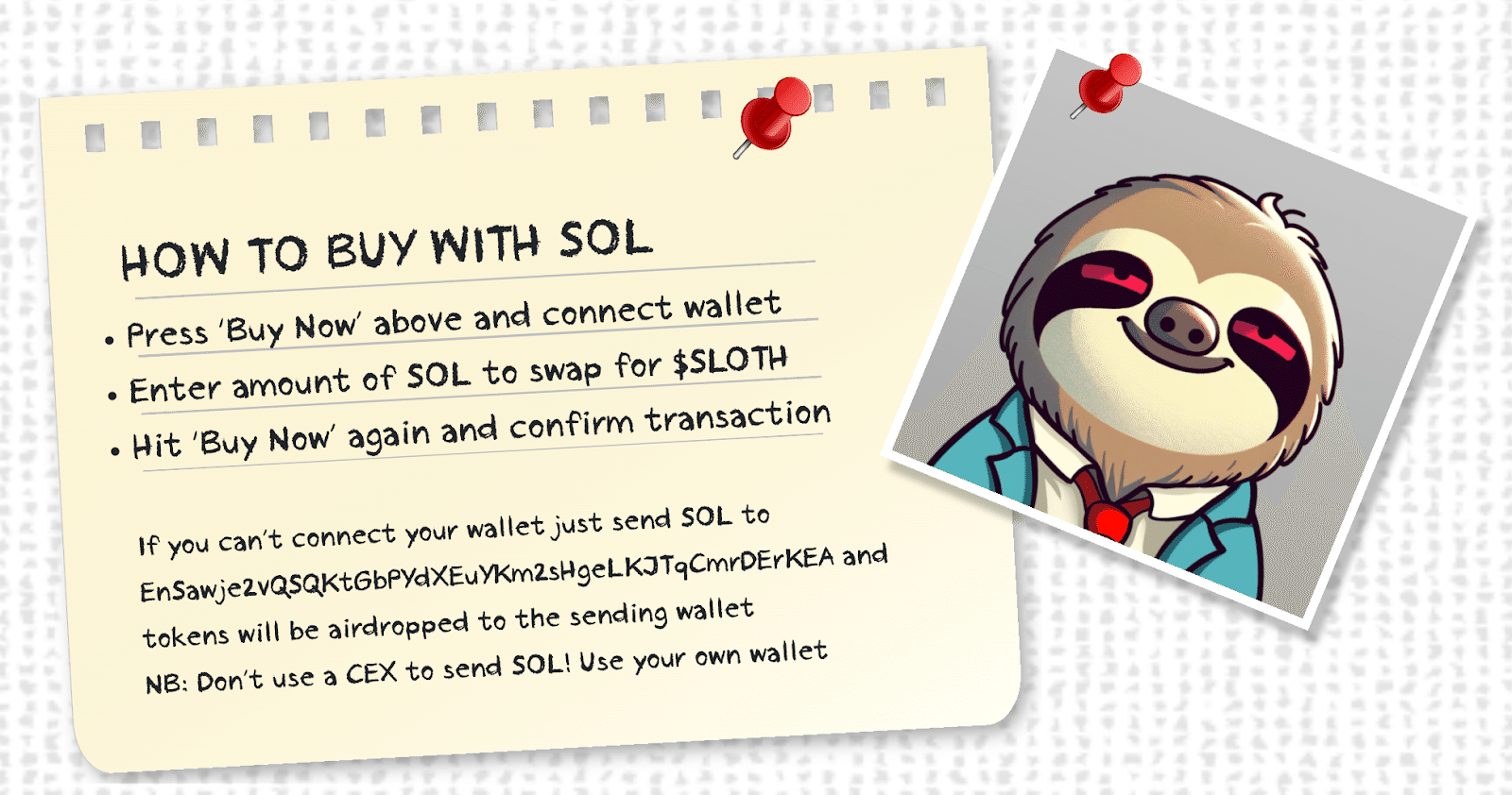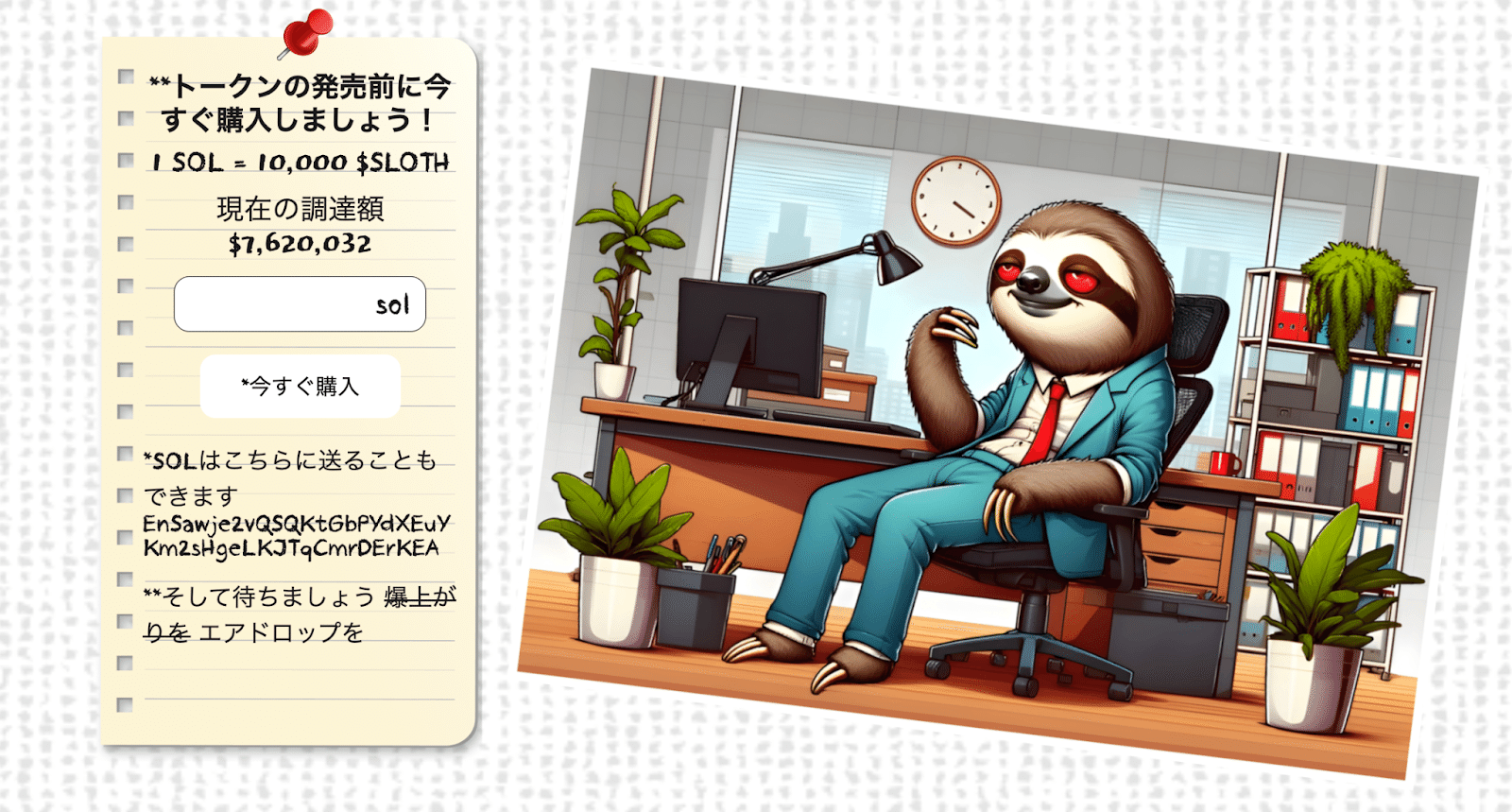 Solanaブロックチェーン上で新たな動きを見せるSlothana($SLOTH)は、MEMEコイン界における最新の話題作です。プレセール段階で既に700万ドルを超える資金を集めるという驚異的な成果を上げ、暗号通貨コミュニティ内外で大きな注目を集めています。この記事では、Slothanaの成功の秘密と、その魅力に迫ります。