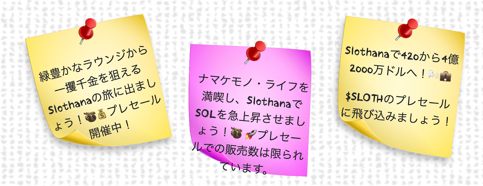 このような透明性の高いコミュニティ参加型のアプローチは、Slothanaがただの通貨を超えた存在であることを強調しており、将来的な発展に向けた明確なビジョンをコミュニティと共有していることを物語っています。
