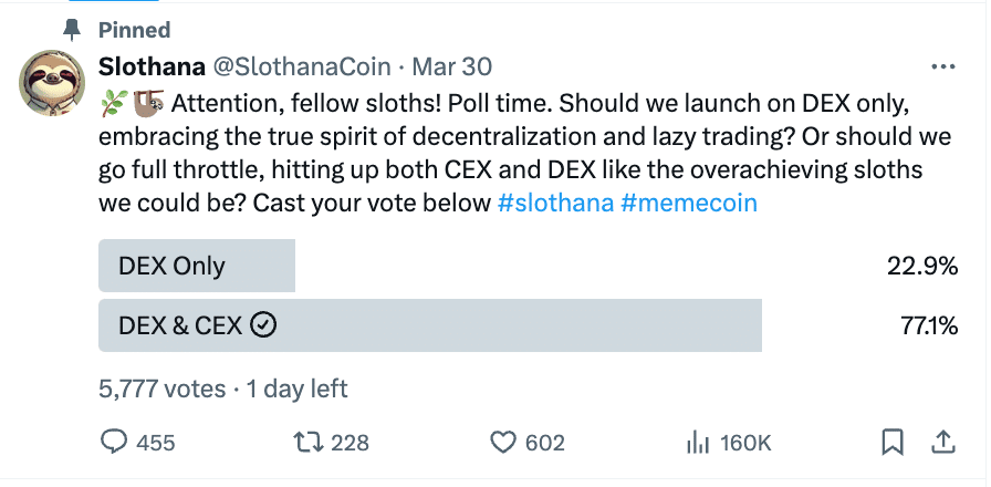 2024年3月30日の投票では、フォロワーは「DEXのみでのリリース」か、「DEXとCEXの両方でのリリース」かを選び、その結果はプロジェクトの進路に大きな影響を及ぼすでしょう。分散型の真の精神を大切にするか、それともより広い市場へと進出していくか。この決定は、SlothanaがどのようなMEMEコインとして成長していくかを示唆するものです。