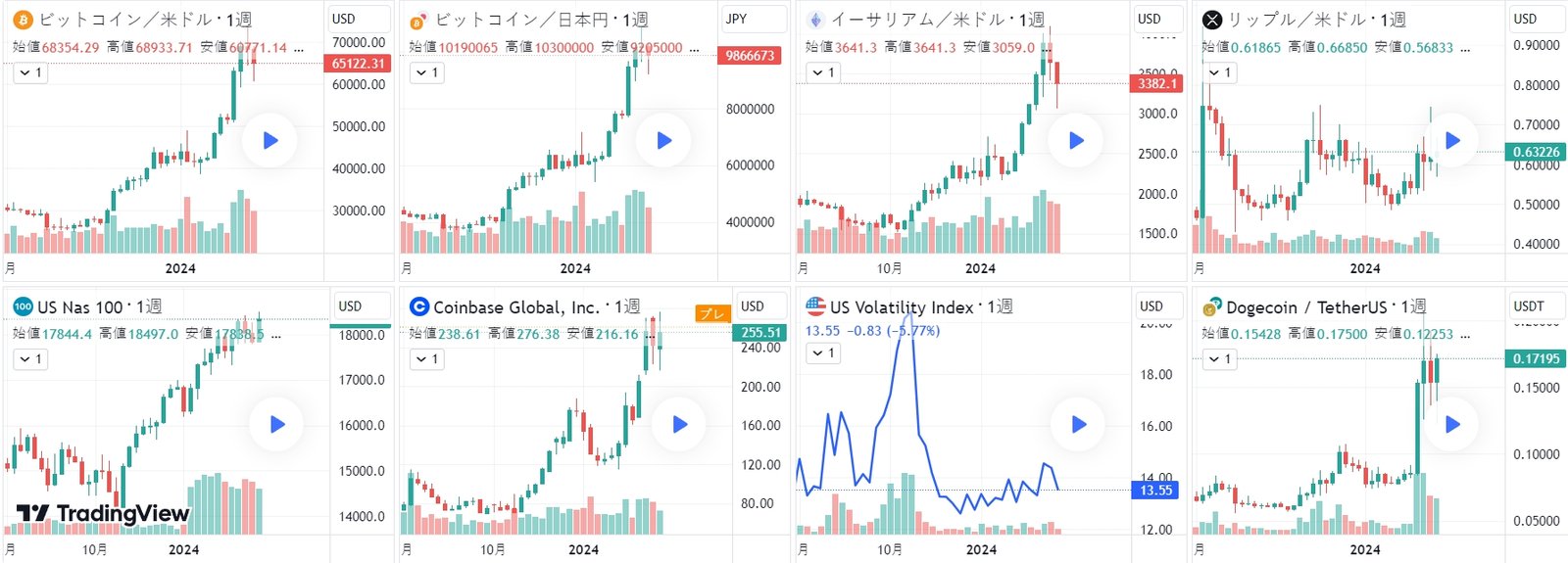 現在、ビットコイン(BTCUSD)、ビットコイン(BTCJPY)、イーサリアム(ETHUSD)、リップル(XRPUSD)、ナスダック(NAS100)、コインベース(COIN)、恐怖指数(VIX)、ドージコイン(DOGEUSDT)の8つのチャートを同時に表示させています。