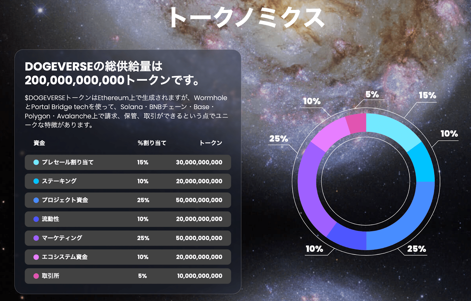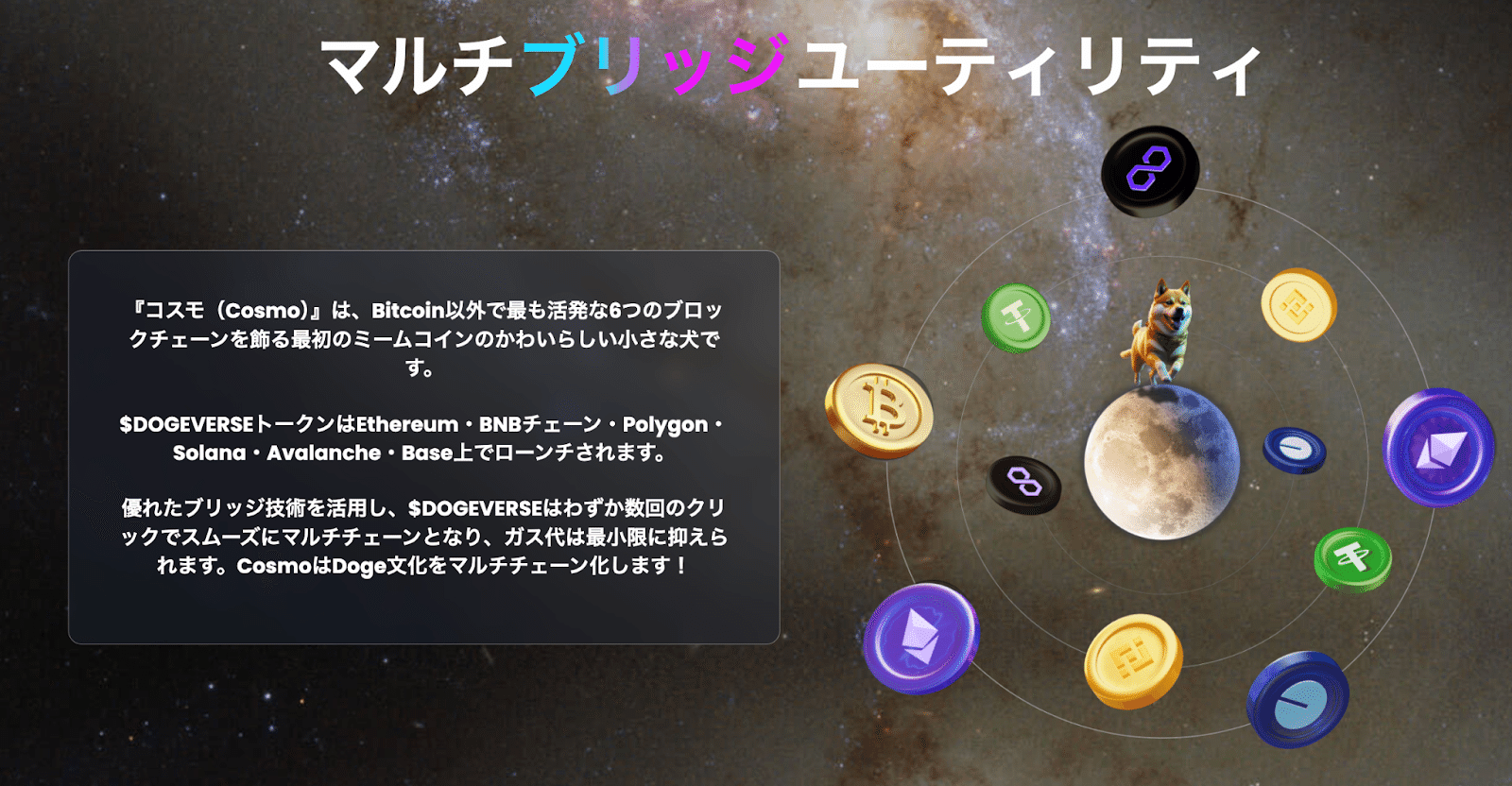 Dogeverseの最も注目すべき特徴は、そのマルチチェーン対応能力です。このプロジェクトは、Ethereum、BNB Smart Chain、Polygonなど複数のブロックチェーンプラットフォームにまたがって機能することができ、将来的にはSolana、Base、Avalancheにも展開する計画があります。このマルチチェーン戦略により、Dogeverseは異なるブロックチェーンの利点を組み合わせ、より広範囲のユーザーと市場へアクセスすることが可能となります。ホワイトペーパー