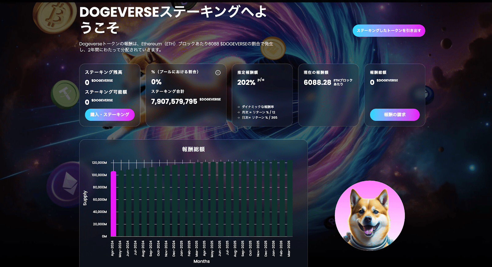 収益性: ステーキングは、保有トークンに対してパッシブインカムを提供し、市場の変動に左右されにくい安定した収益源となり得ます。セキュリティ強化: 多くのユーザーがトークンをステーキングすることで、ネットワークの分散化とセキュリティが強化されます。コミュニティ参加: ステーキングはユーザーにプロジェクトへのより深い関与を促し、コミュニティの結束を高める効果があります。Dogeverseのステーキング機能は、プロジェクトの長期的な成功に寄与する設計とされており、ユーザーにとっても魅力的な投資機会を提供する重要な要素です。プロジェクトの成長と共に、ステーキングによる報酬やその他のインセンティブがさらに改善されることが期待されます。Staking詳細