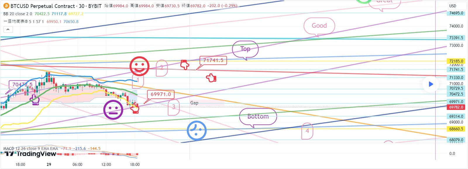 2. 71741.5ブルロングポジション1次ターゲット -> Topから上段に順番にターゲットが
