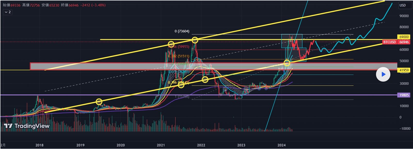 水平では50000付近(チャート上赤のボックス)まで下落したら現物購入していく。