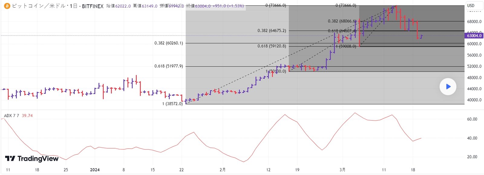 ビットコイン/米ドルはADX(7)が60を超えて危険水準に到達していたため、持ち高を調整し、利益を確定させる売りに押されて下げてきた。上昇トレンドは維持されると考えられるが、気になるのはビットコイン/米ドルのサポートゾーンである。