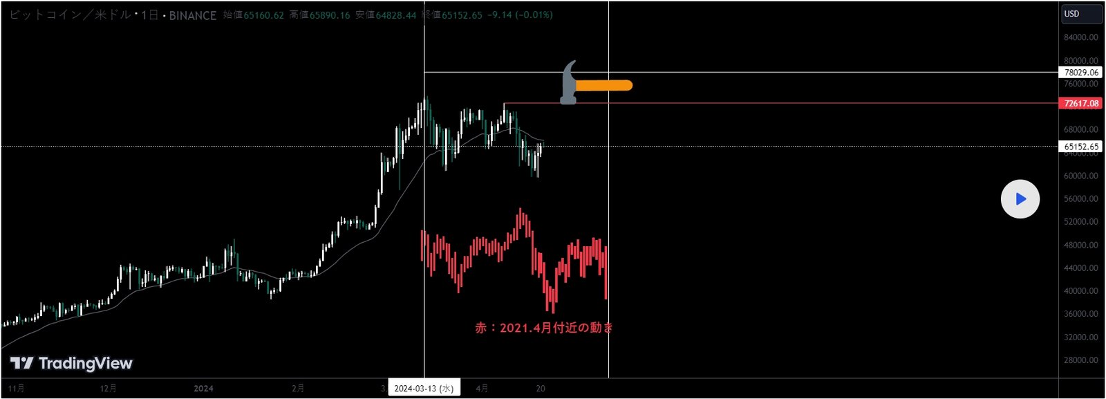 半減期やその価値についてはよく分からないが、過去チャートなどから現在値65000付近からもう一山あっても良いように見えます。