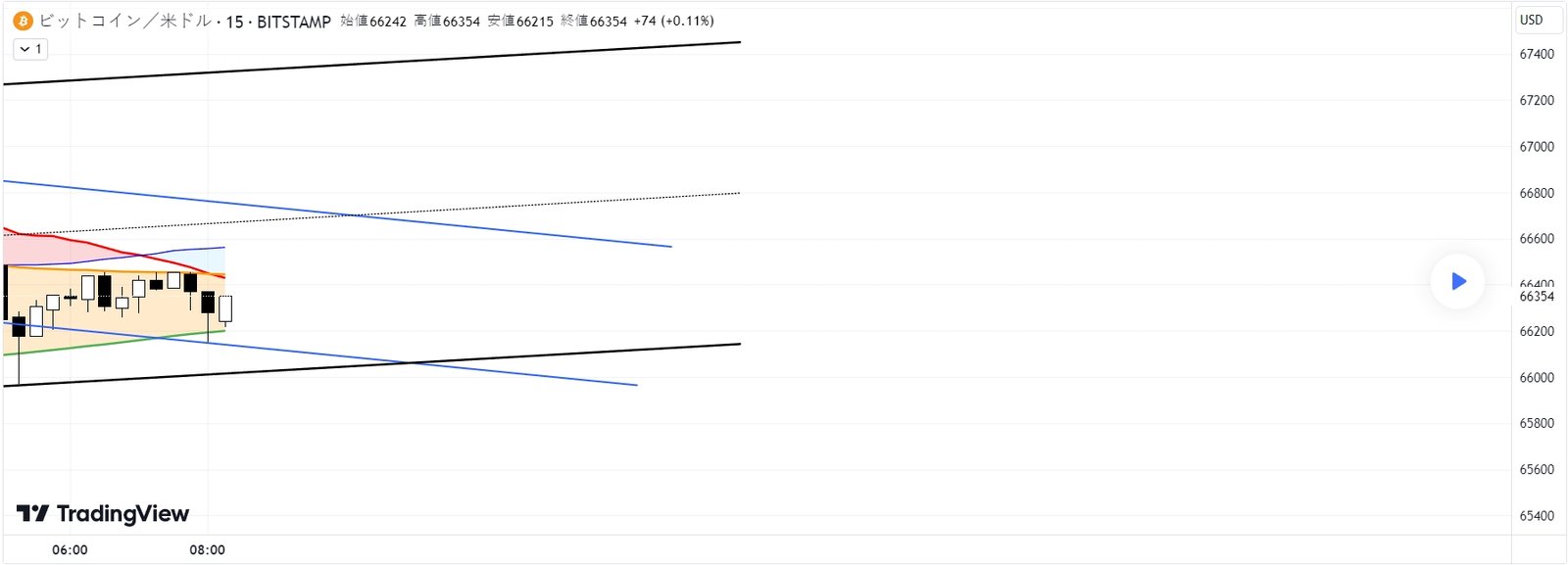 今現在(2024/04/24/8:25)、ブルーの切り下げているチャネルを上抜けていけば、ブラックのチャネルの上限まで上がっていくだろうという見立てです。