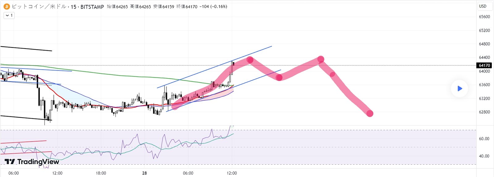 今現在(2024/04/28/12:15)は上昇の最中ですが、一旦調整の売りが入り、その後また上昇していくパターンですね。今回は長い期間を経て上がってきているので、調整の時間も長めになることが予測されます。