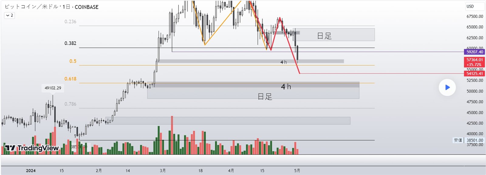 オレンジの3波の後に59000ドル割った事で赤色の3波を取りに来てます。