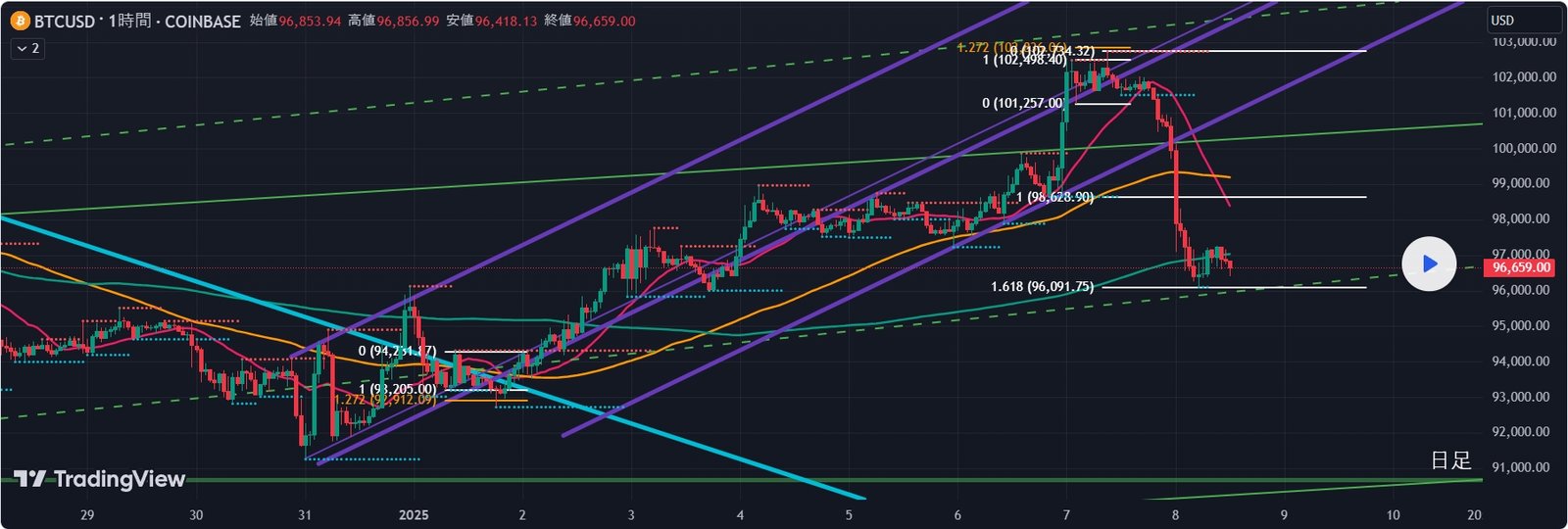 1時間足です。1.618や、移動平均線(1時間足の200、4時間足の80、日足の20)や、日足のチャネル下限付近です。