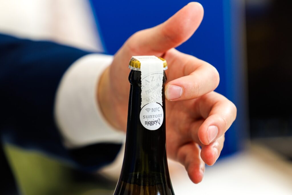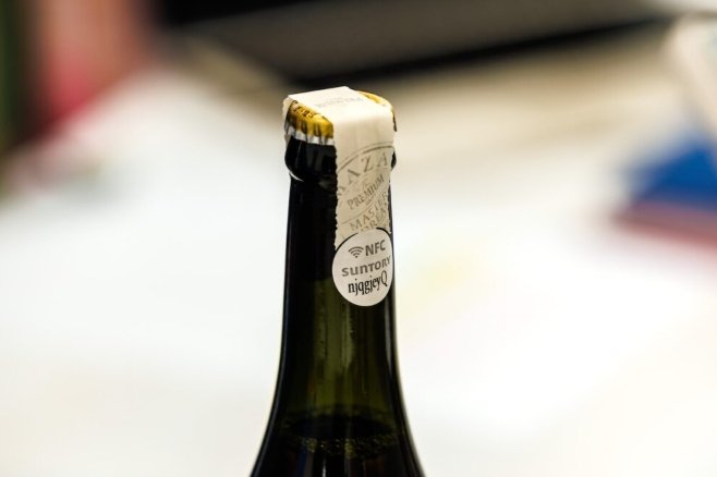 まず、この製品のビール瓶には、王冠を覆う形で電子タグ(NFC)入りのシールが貼られている。つまり、ビールを開栓するためには、シールを破る必要がある。