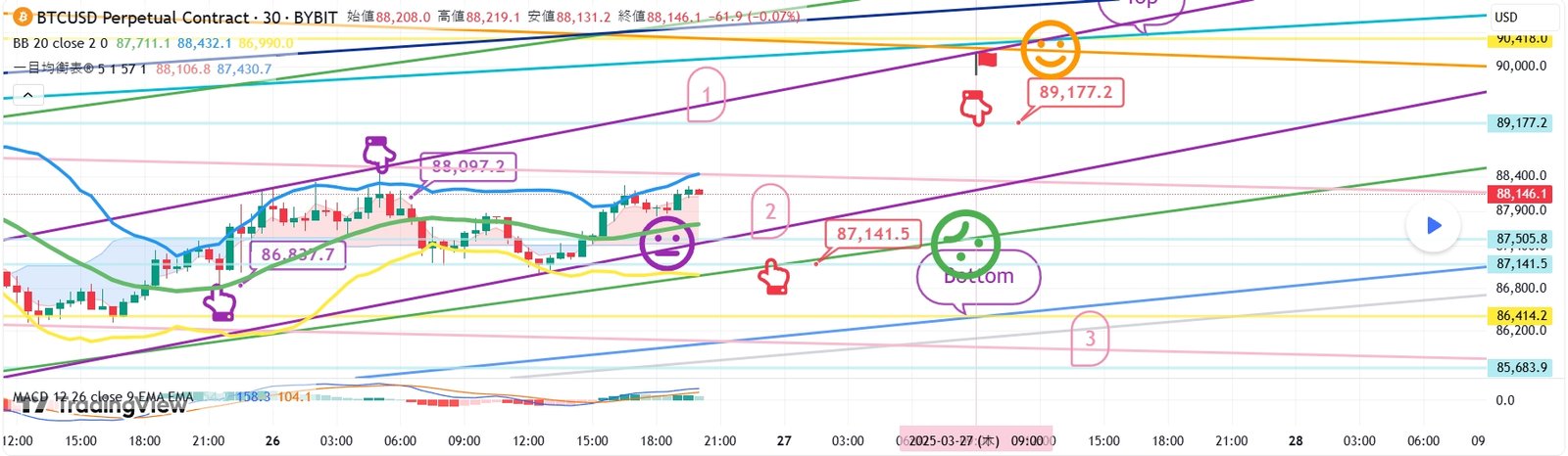 1. 87141.5ドルのロングポジションエントリーポイント/緑のサポートラインが破られたときのストップロス価格